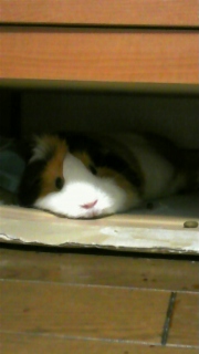 チェストの下で寝そべるモルとそれを必死に撮るわたし。